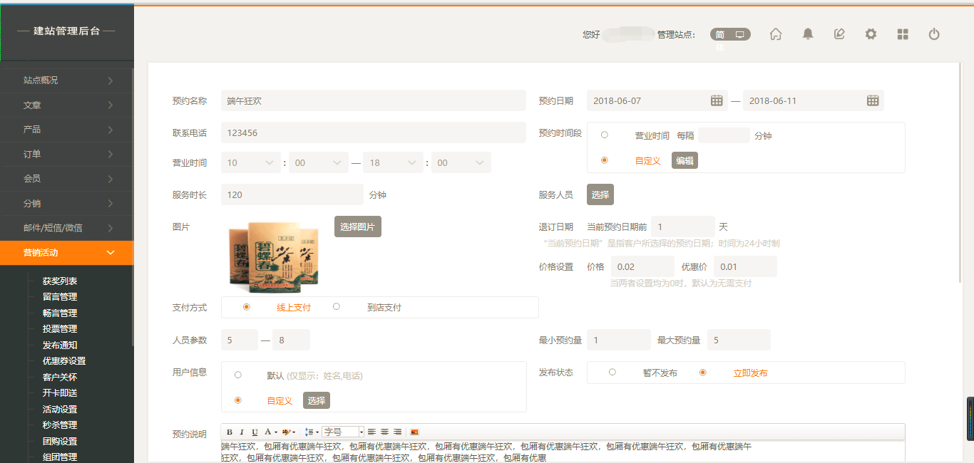1.后台“小程序应用”-“预约”中,点击“创建预约”,里面可以添加该预约产品的信息内容,点击“保存”后,页面会显示该预约内容。